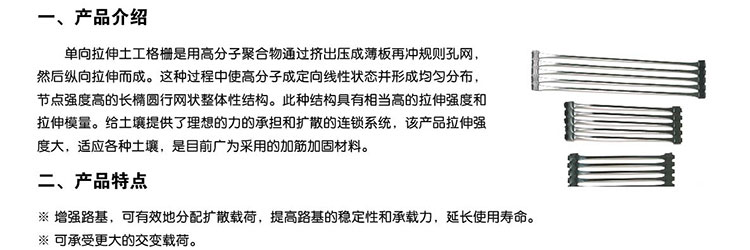 單向拉伸的土工格柵是由高分子聚合物經(jīng)擠出壓成薄板再?zèng)_規(guī)則孔網(wǎng),然后縱向拉伸而成。這種過(guò)程中使高分子成定向線性狀態(tài)并形成分布均勻、節(jié)點(diǎn)強(qiáng)度高的長(zhǎng) 橢圓形網(wǎng)狀整體性結(jié)構(gòu)。此種結(jié)構(gòu)具有相當(dāng)高的拉伸強(qiáng)度和拉伸模量,特別是我公司此類產(chǎn)品更具有超國(guó)際水平的高早期(伸長(zhǎng)率在2%—5%)拉伸強(qiáng)度和拉伸模 量。給土壤提供了理想的力的承擔(dān)和擴(kuò)散的連鎖系統(tǒng)。該產(chǎn)品拉伸強(qiáng)度大(>150Mpa),適應(yīng)各種土壤,是目前廣為采用的加筋加固材料。